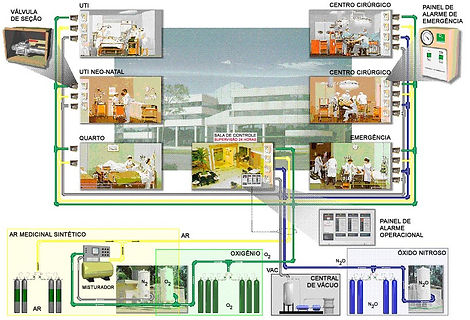 Esta figura esquemática mostra praticamente todas as centrais de gases medicinais e os setores que os utilizam: (Crédito: Eng. Edson Ibaldo)
